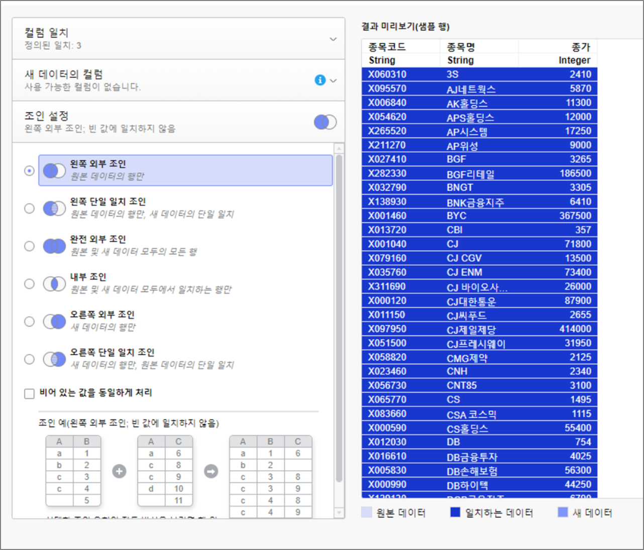 2) 내부/외부는 기준이 되는 Table은 보존이되고 연결되어 붙여지는 Table에 기준점이 되는 key값의 value가 없을 때