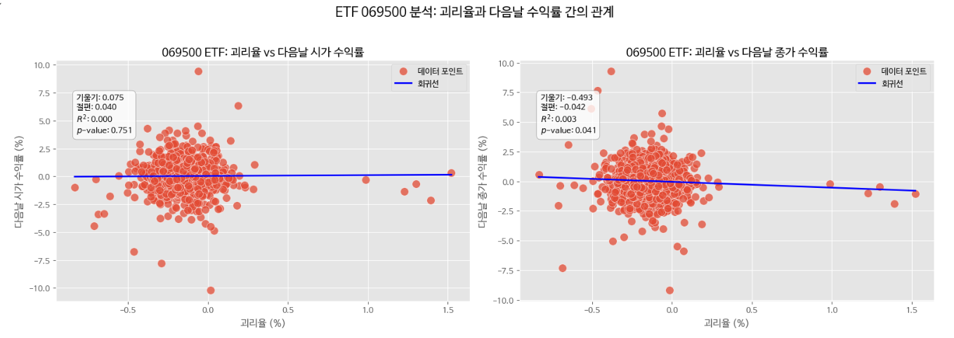 - scipy.stats.linregress를 사용해 괴리율과 다음날 수익률 간의 선형 회귀 분석을 수행합니다.
