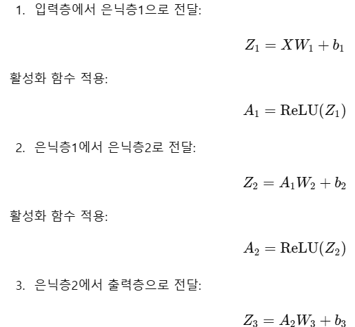 - 입력층 → 은닉층1 → ReLU → 은닉층2 → ReLU → 출력층