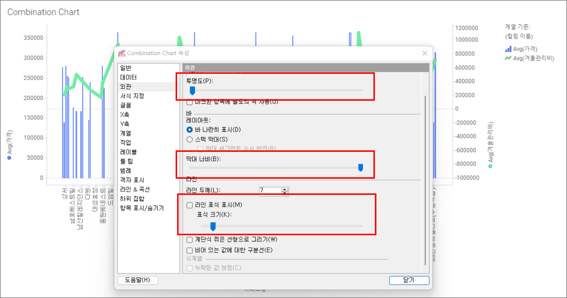 마우스 오른쪽 버튼 → 속성 → 외관을 클릭하여 Chart의 투명도 및 Bar의 너비, 라인의 두께 & 표식 설정 등을 Setting 할 수 있습니다.