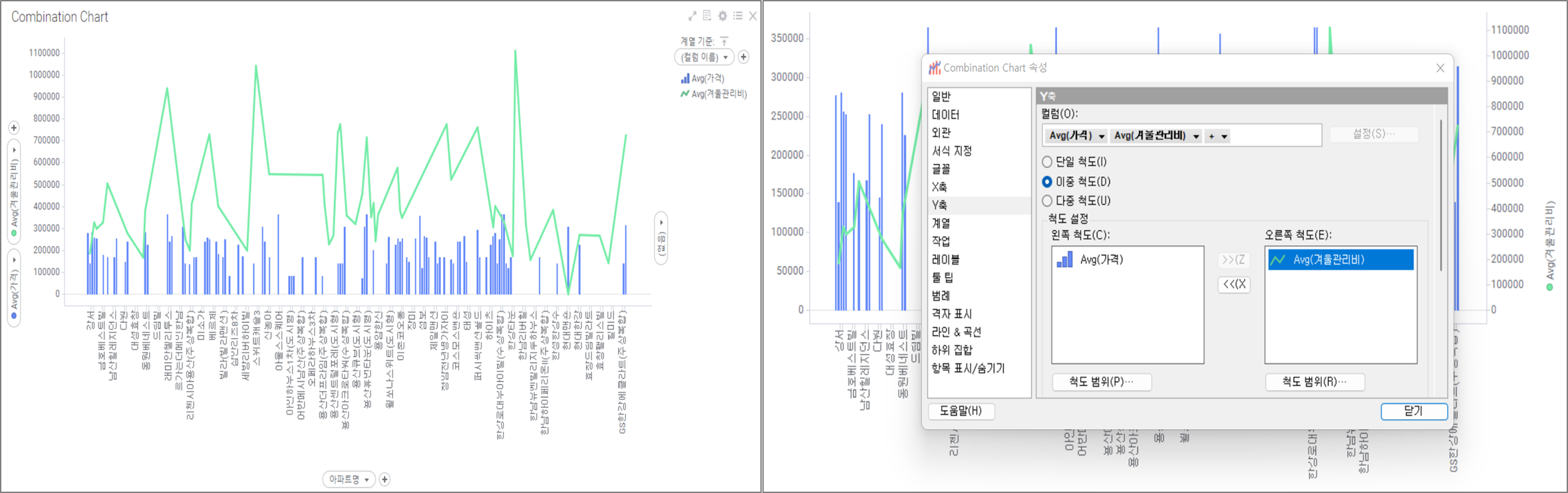 마우스 오른쪽 버튼 → 속성 → Y축을 클릭합니다. 이후 중간에 이중 척도를 클릭한 후 오른쪽 척도에 표현하고 싶은 Column을 선택하여 이동시킵니다.