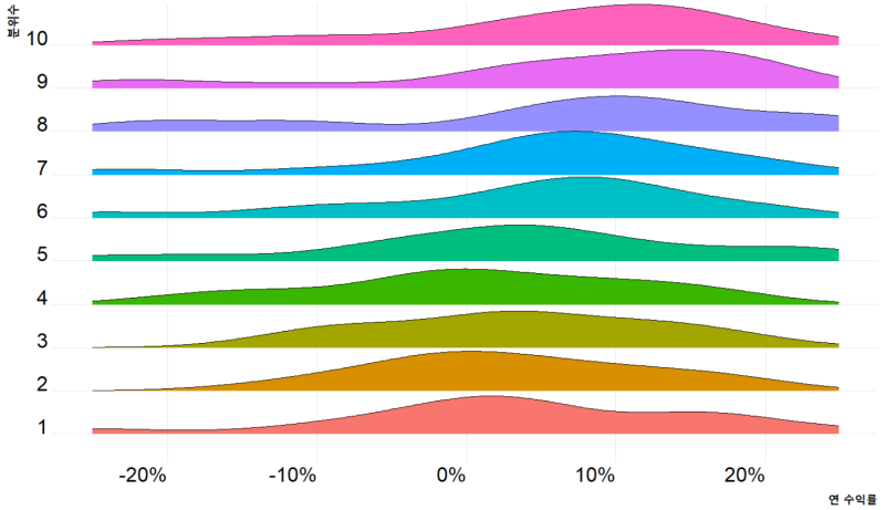 이에 그룹간 연 수익률의 분포 차이를 추가로 확인해보고자 한다.