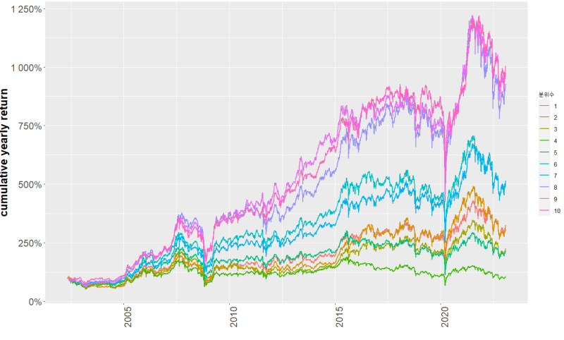 먼저 배당 수익률에 따른 수익률 차이가 있는지 확인하고자 월말 기준 한국 시장 전 종목의 배당 수익률을 크기에 따라 1~10 분위수로 나누어서 1달 단위로 종목을 리벨런싱하는 방식으로 누적 수익률을 산출했다