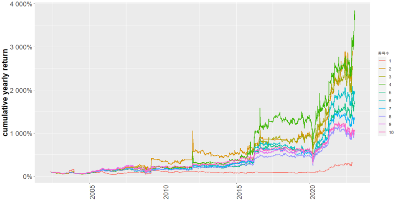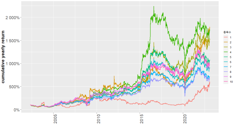 매월 첫 거래일 종목 수를 1~10개로 구성하여, 10개의 포트폴리오의 누적 수익률을 비교한 결과이다. (2002.05~2023.01)