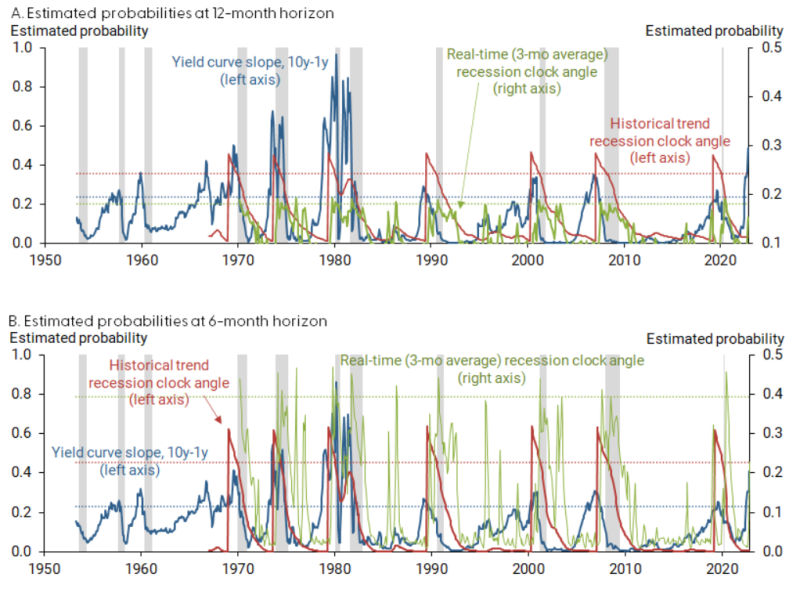 상단의 12개월 이후 예측 그래프에서는 장단기 금리차 기울기가 가장 신뢰할 수 있었으며, 하단의 6개월 이후 예측 그래프에서는 실업률 기반한 추정치가 장단기 금리차 곡선의 기울기를 상회하는 것을 보여준다.