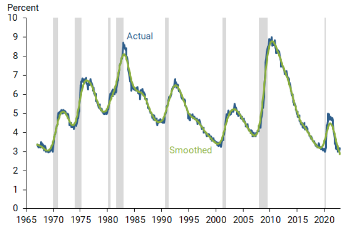 실직하고 일시적으로 정리 해고된 근로자를 조정한 평활화된 실업률(The smoothed jobless unemployment rate)은 일반적으로 경기 확장기에 지속적으로 하락하고 경기 침체 전에 돌아서며 경기 침체기에 상승한다