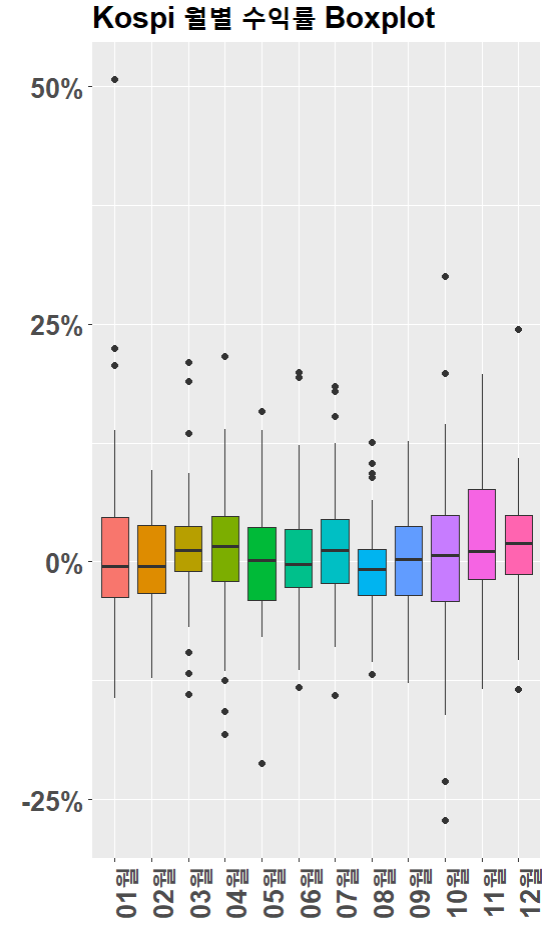 3월, 7월, 11월, 12월 의 수익률의 분포가 (+)로 상당히 치우쳐 있는 것을 볼 수 있다