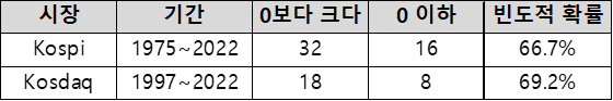 또한, 영상에서 나온 빈도주의적 확률로 봤을 때에도 Kospi, Kosdaq 모두 월별 수익률이 0보다 큰 것을 볼 수 있다