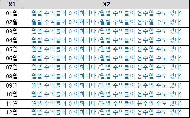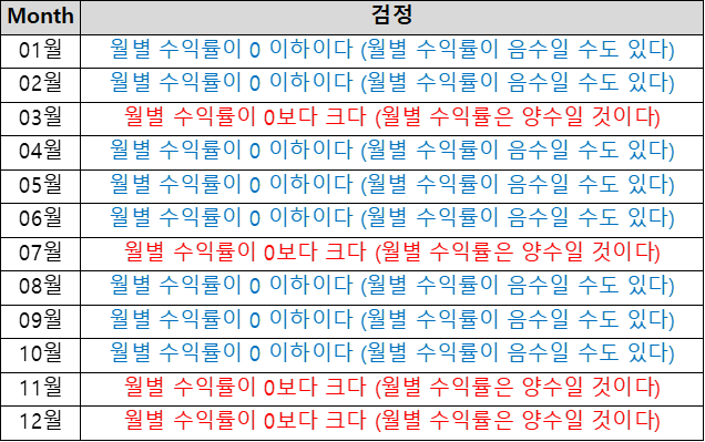 - null_hypothesis : "월별 수익률이 0 이하이다 (월별 수익률이 음수일 수도 있다)"