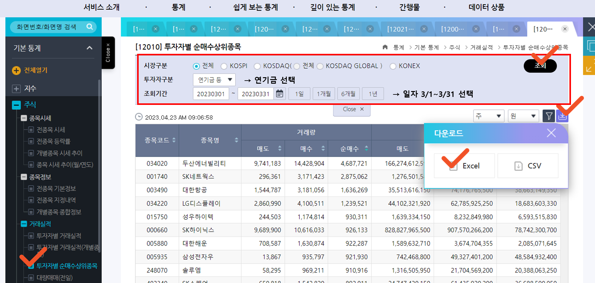 [실습] 가정 : 23년 3월 연기금 거래대금 기준 순매수 Top3 종목들은 상승할 확률이 높다