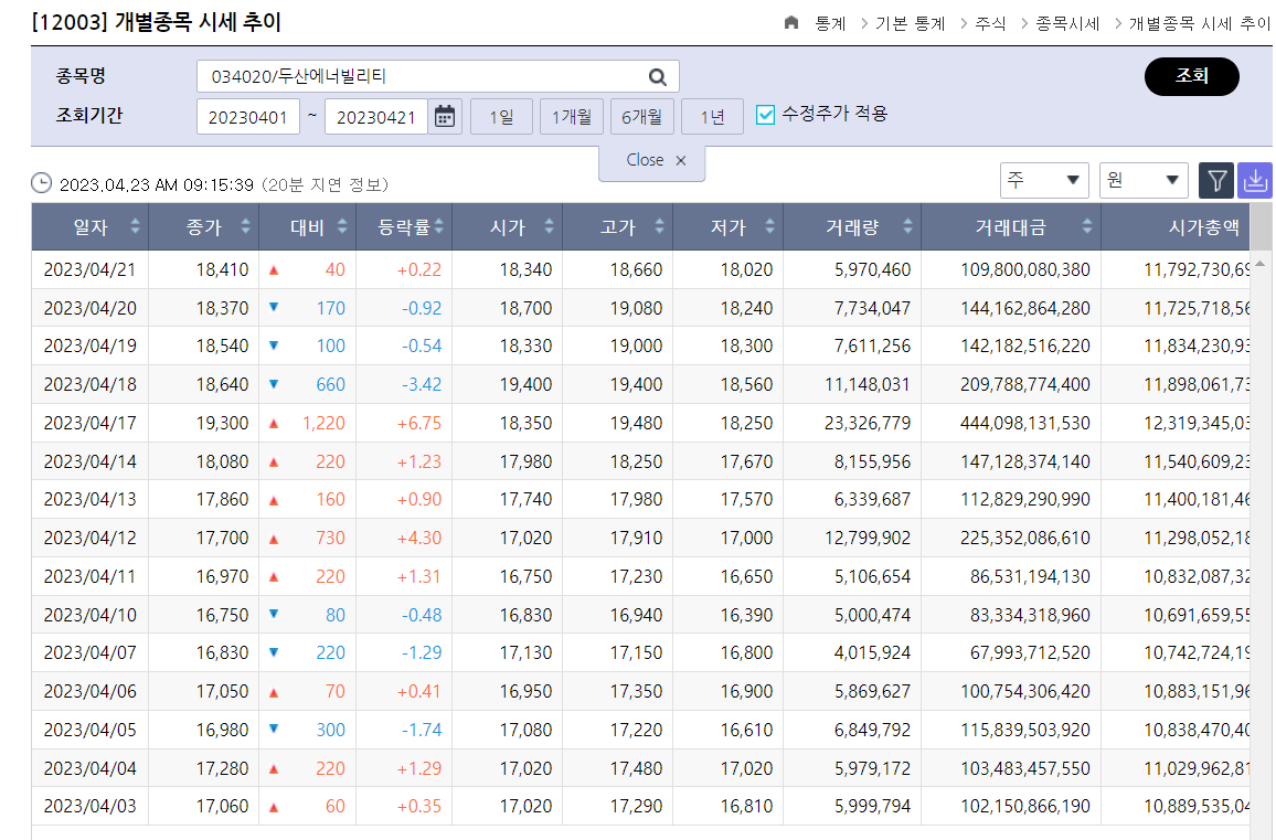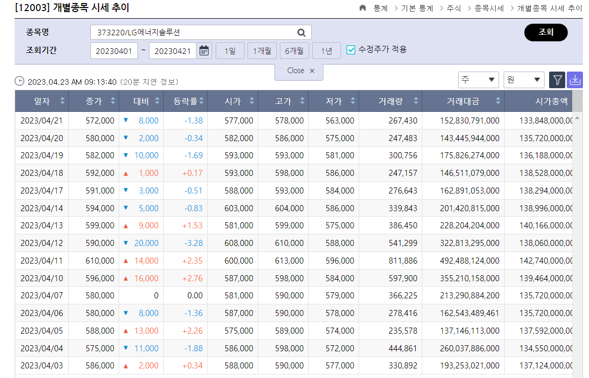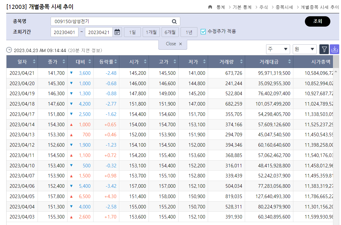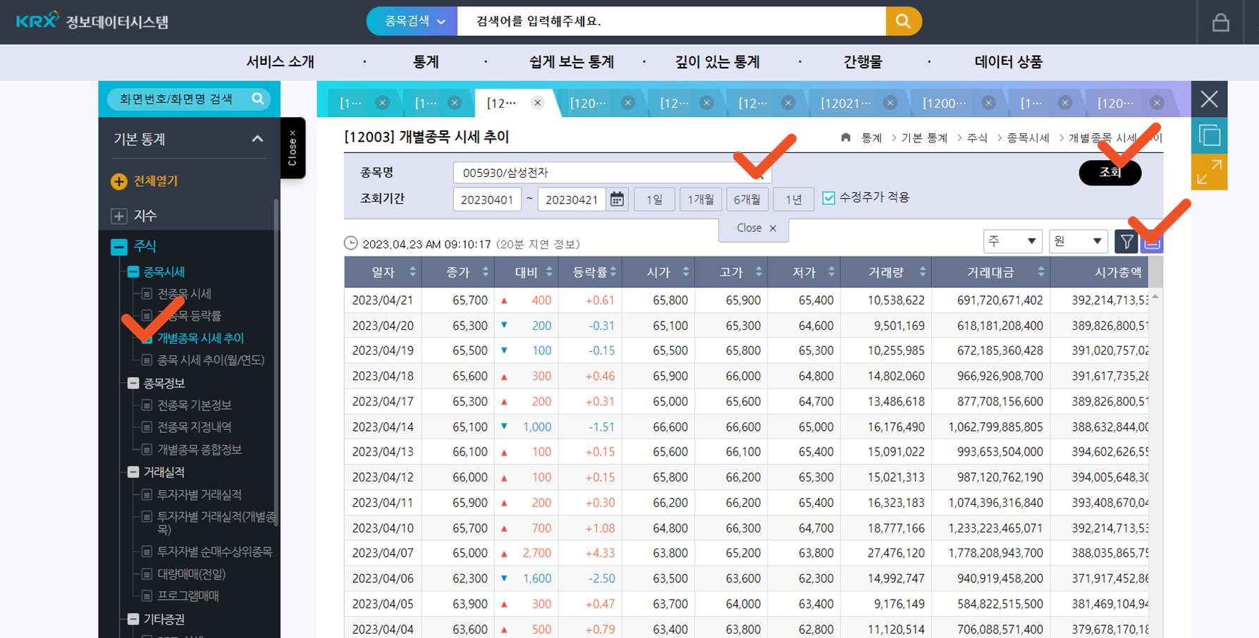 주식 → 종목시세 → 개별종목 시세 추이 에서 확인이 가능합니다