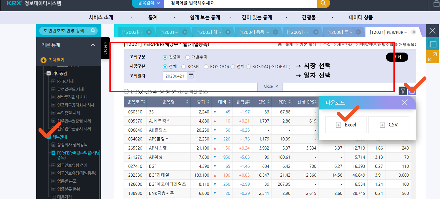 이번에는 주식 → 세부안내 → PER/PBR/배당수익률(개별종목)을 살펴보겠습니다