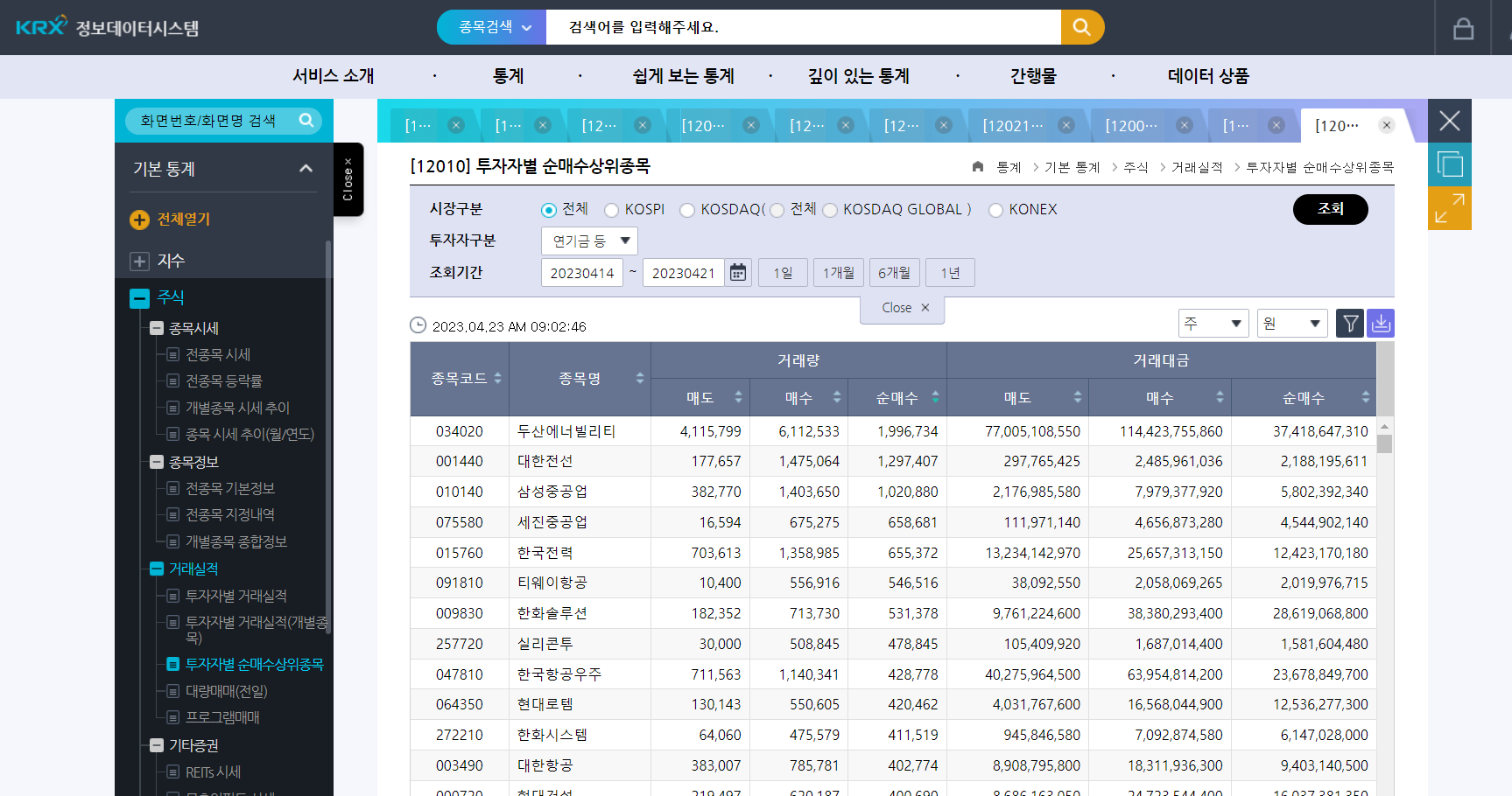 추가적으로 많이 활용되는 table은 주식 → 거래실적 → 투자자별 순매수상위종목 입니다