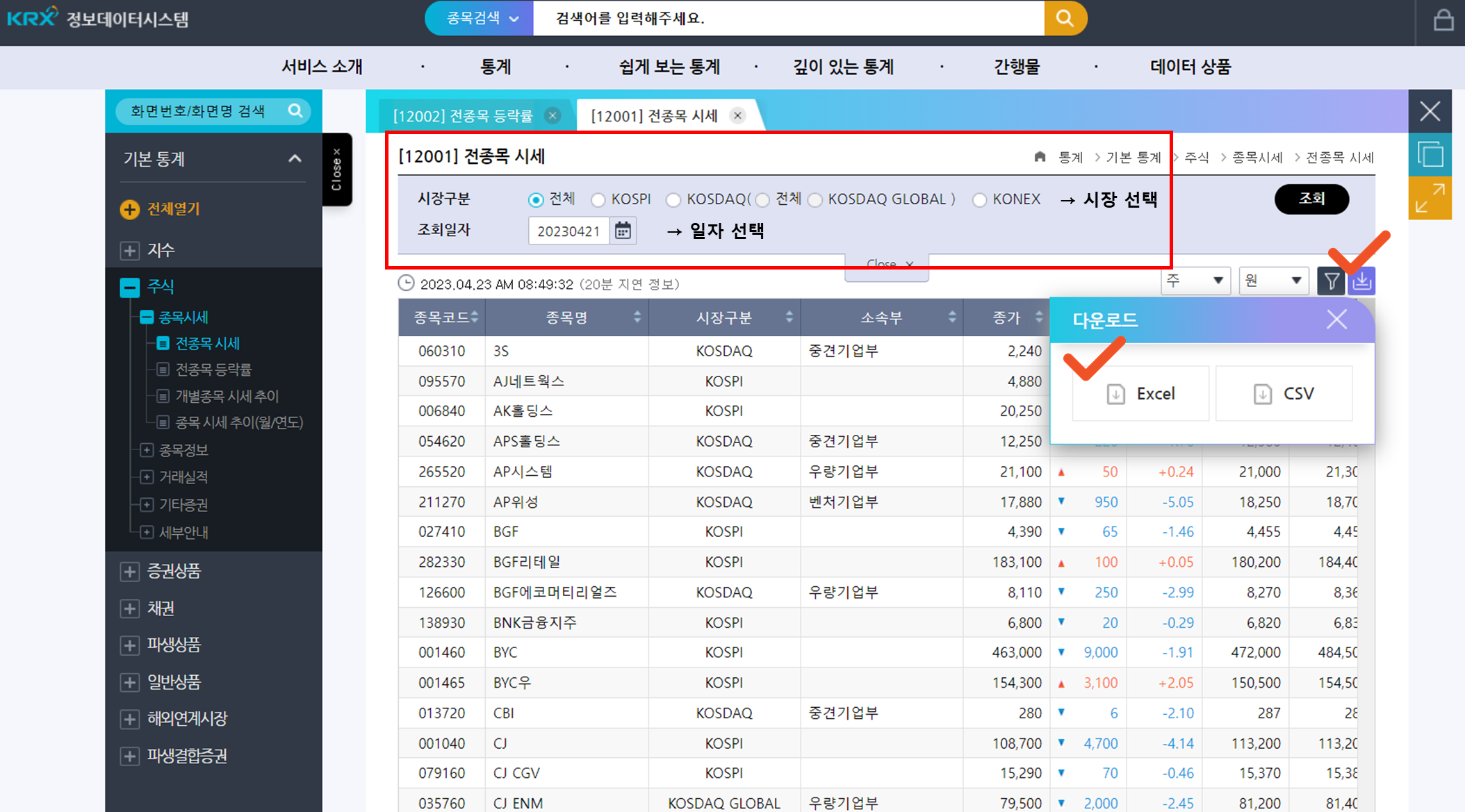 상단에서는 시장과 일자를 선택할 수 있고, 우측을 보시면 다운로드 표시가 있는데, Excel을 다운로드 받아보겠습니다