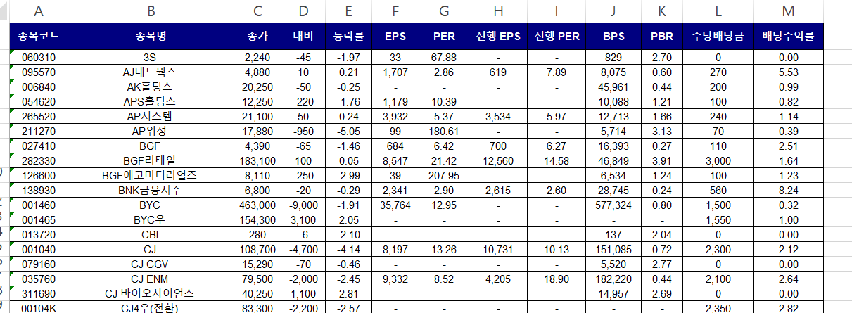 해당 table에서는 일반적으로 EPS, PER, 선행 EPS, 선행 PER, BPS, PBR, 주당배당금, 배당수익률 데이터를 많이 활용합니다. (주식 → 종목시세 → 전종목 시세) table과 join하여 사용하는 것이 일반적입니다.