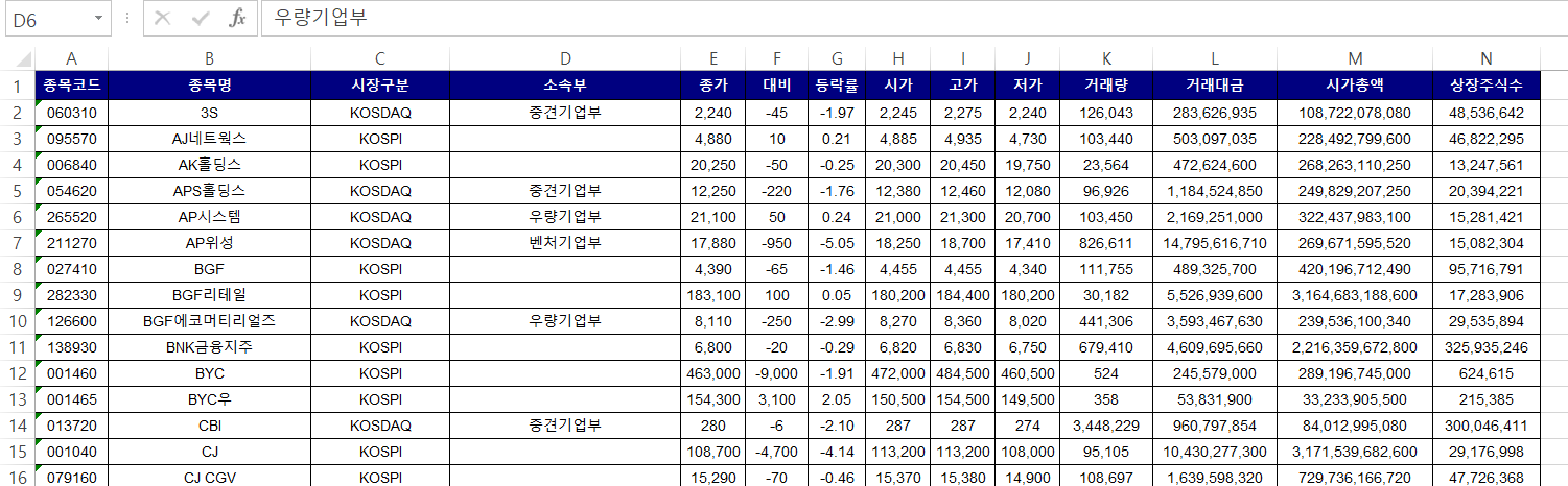 일반적으로 해당 table에서는 종가, 등락률, 시가, 고가, 저가, 거래량, 거래대금, 시가총액 데이터를 많이 활용합니다