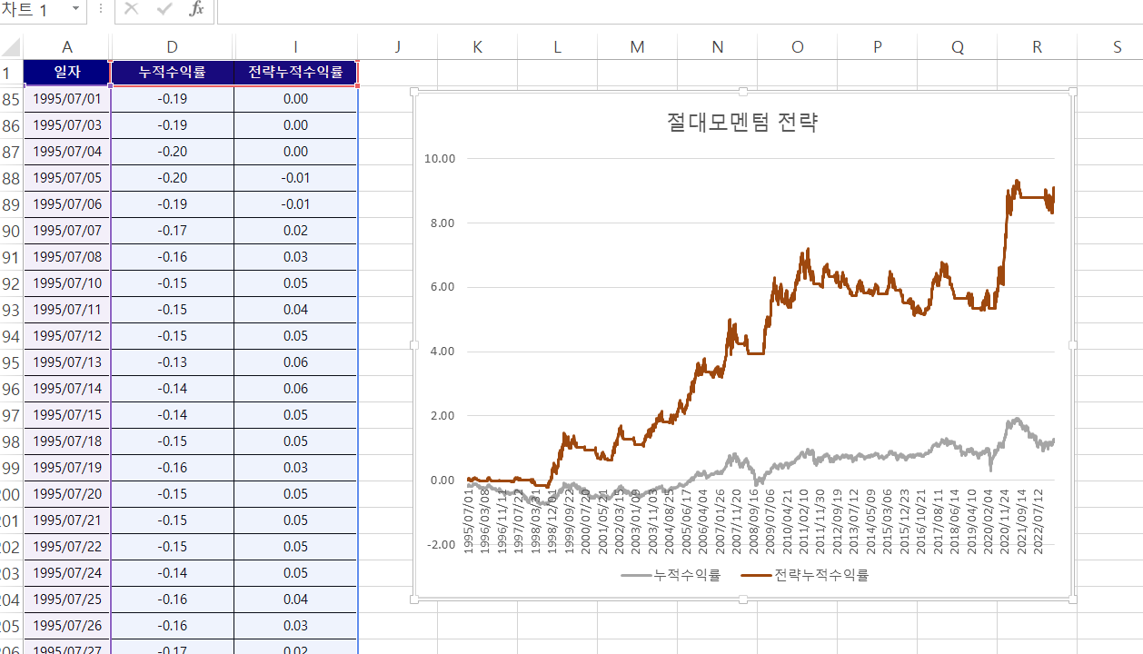 절대모멘텀 전략은 과거의 평균 가격보다 높으면 매수, 낮으면 매도하는 전략입니다