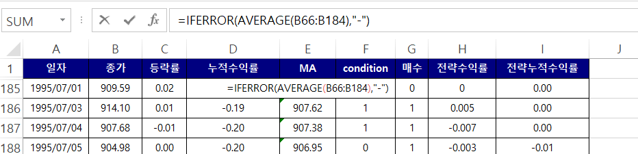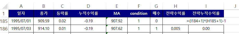 condition이 0 → 1로 바뀌면 매수의 signal이 되는 것인데, 해당 일의 종가에 들어가기에 수익은 다음날 부터 적용이 됩니다