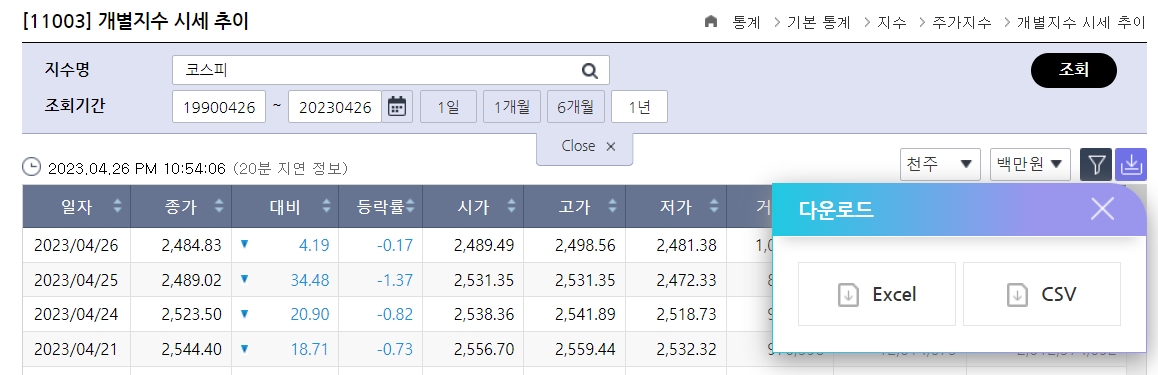상단 지수명이라는 곳에 하단과 같이 코스피라고 입력을 하고 조회 기간을 1990~2023년으로 설정해보겠습니다