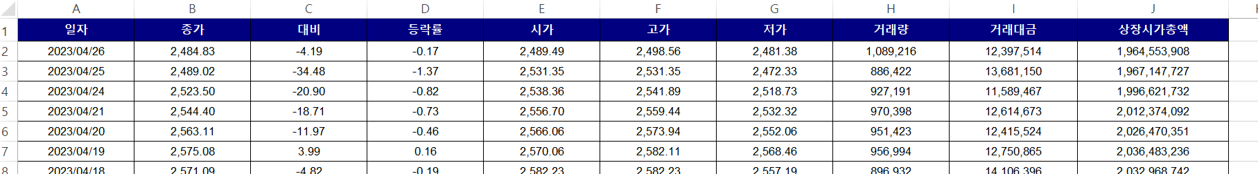 그러면 해당 기간의 코스피 주가 데이터를 조회할 수 있습니다
