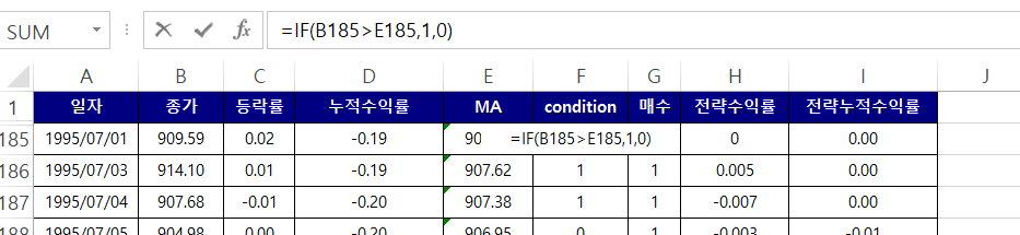 절대모멘텀 전략은 금일 종가가 이동평균선보다 위에 있을 때 매수하는 전략으로 이동평균보다 종가가 위에 있으면 1 아래에 있으면 0으로 설정합니다