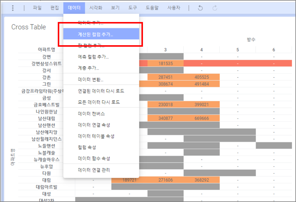 해당 기능은 Spotfire Report 상단 데이터 → 계산된 컬럼 추가 를 클릭하여 사용할 수 있습니다.